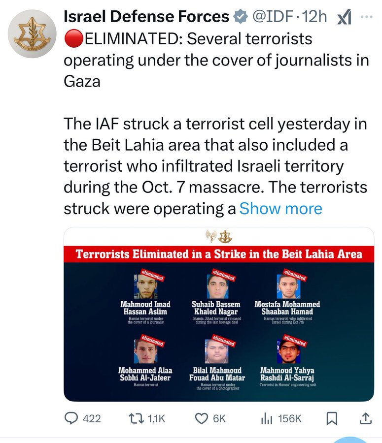 The IDF's official account on X claimed the massacre as an attack on a "terrorist cell yesterday in the Beit Lahia area that also included a terrorist who infiltrated Israeli territory during the Oct. 7 massacre. The terrorists struck were operating a drone intended to carry out terrorist attacks against IDF troops operating in Gaza, the drone was consistently used by the Islamic Jihad Terrorist Organization." The post featured the following image and was quickly debunked by Palestinian journalists, activists and the Government Media Office as it contained several mistakes as to the identities of the victims. This casted serious doubts on the veracity of Israel's claims and intel: