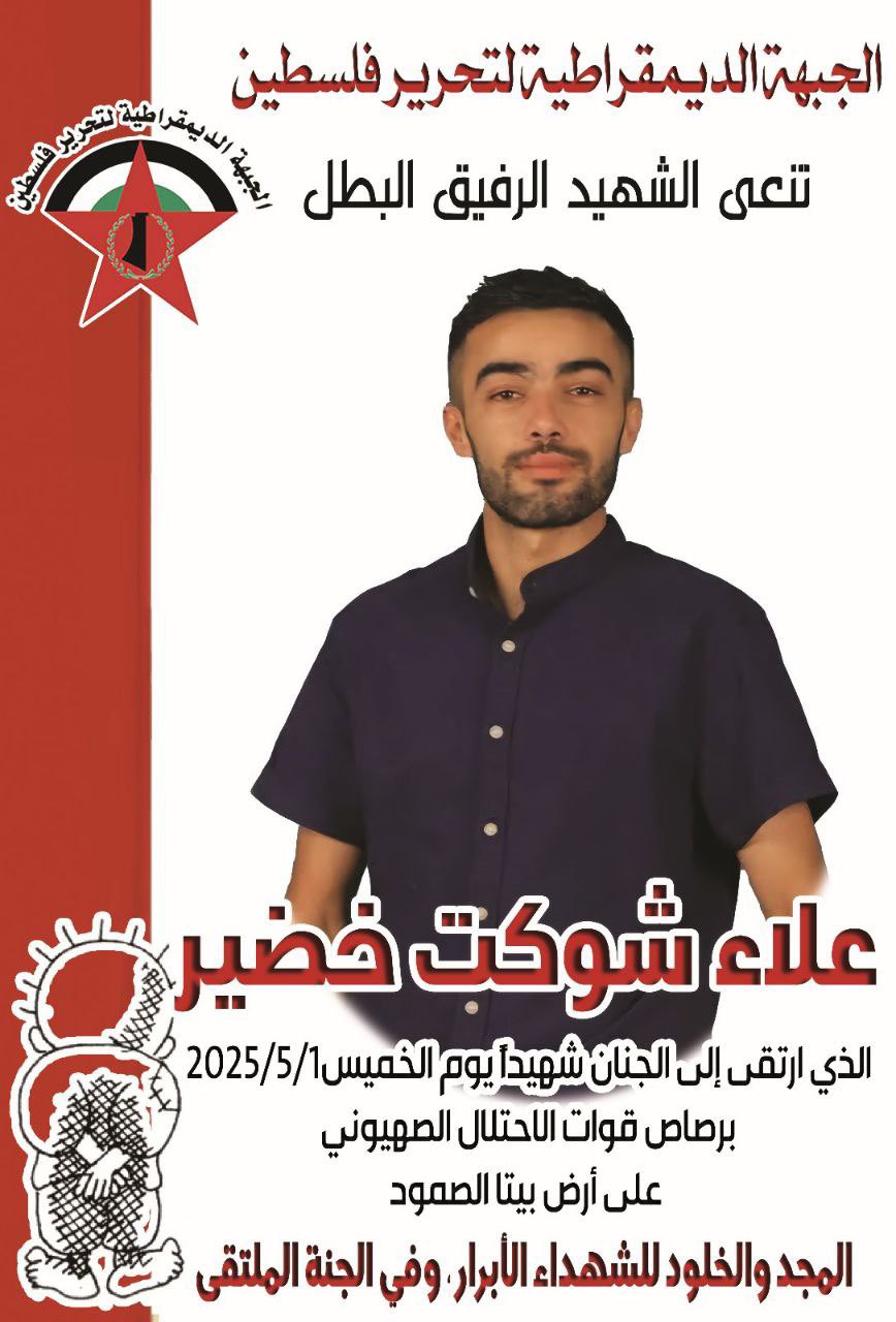 They issued a statement mourning Alaa Shawkat Khudair, 29, who was killed in Beita during confrontations with Israeli forces, which had besieged the town for days. The Front praised him as a hero and reaffirmed that popular resistance is the only path to freedom. It called for escalating action against the army and settlers, unifying resistance factions, and rebuilding Palestinian institutions democratically to achieve liberation, return, and independence.