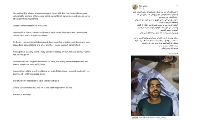 Dr. Izzeddin Shaheen who works in central Gaza reported that Al-Awda hospital received over 60 injuries from the aid site, refering to the one in Netzarim. As of 4 am, all the aid at Netzarim had already been taken, leaving most aid seekers empty-handed.