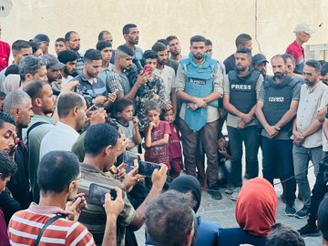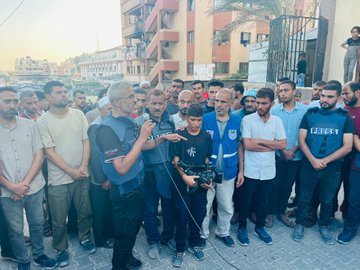 Around 10:10 am, an Israeli strike targeted the upper floors of the Al-Yasin buildings at the Nasser Medical Complex in Khan Younis where several journalists were gathered to access internet to perform their work.