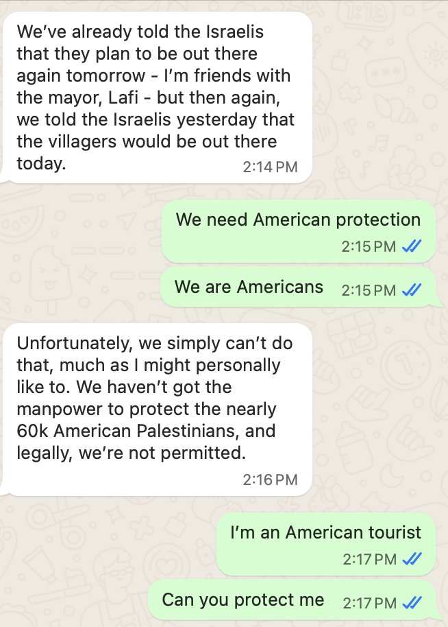 Assault on the US activist and independant journalist, Jasper Nathaniel,(@infinite_jaz) who was reporting on the ground, by dozen of masked and armed settlers. "If I am killed in the West Bank, please know that I blame you personally @GovMikeHuckabee. I was set up by the IDF to be attacked by 100 armed settlers. When I sent the embassy the video and asked for protection for me and everyone else in Turmus’ayya, they literally said no."