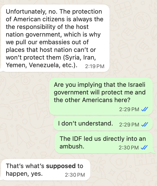 Blocked in the plain between two hills — one occupied by armed settlers, the other by soldiers — Jasper Nathaniel tries to negotiate his escape with the soldiers. They seem to let them go, but... "8:42 AM: I walk back to the car, and we drive up. I mistakenly think the soldiers said they would make the settlers leave. Instead, as soon as we arrive, the soldiers speed away—leaving us facing two settlers on an ATV, one of them armed. A few other farmers are there too, beside a car with a smashed windshield."