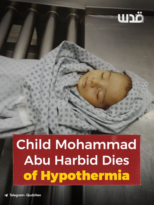 On January 11, 2026: Mohammed Wissam Abu Harbeed (two months old) in Gaza City due to the severe cold. He was less than a month old. He froze to death this morning in a displacement camp in Khan Younis, in the southern Gaza Strip